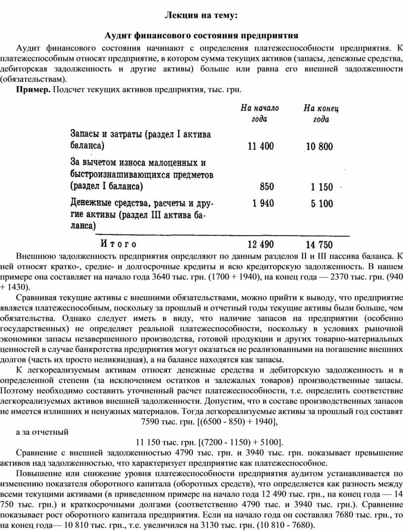Аудит финансового состояния начинают с определения платежеспособности предприятия. К платежеспособным относят предприятие, в котором сумма текущих активов (запасы, денежные средства, дебиторская задолженность и другие активы) больше или равна его внешней задолженности (обязательствам).