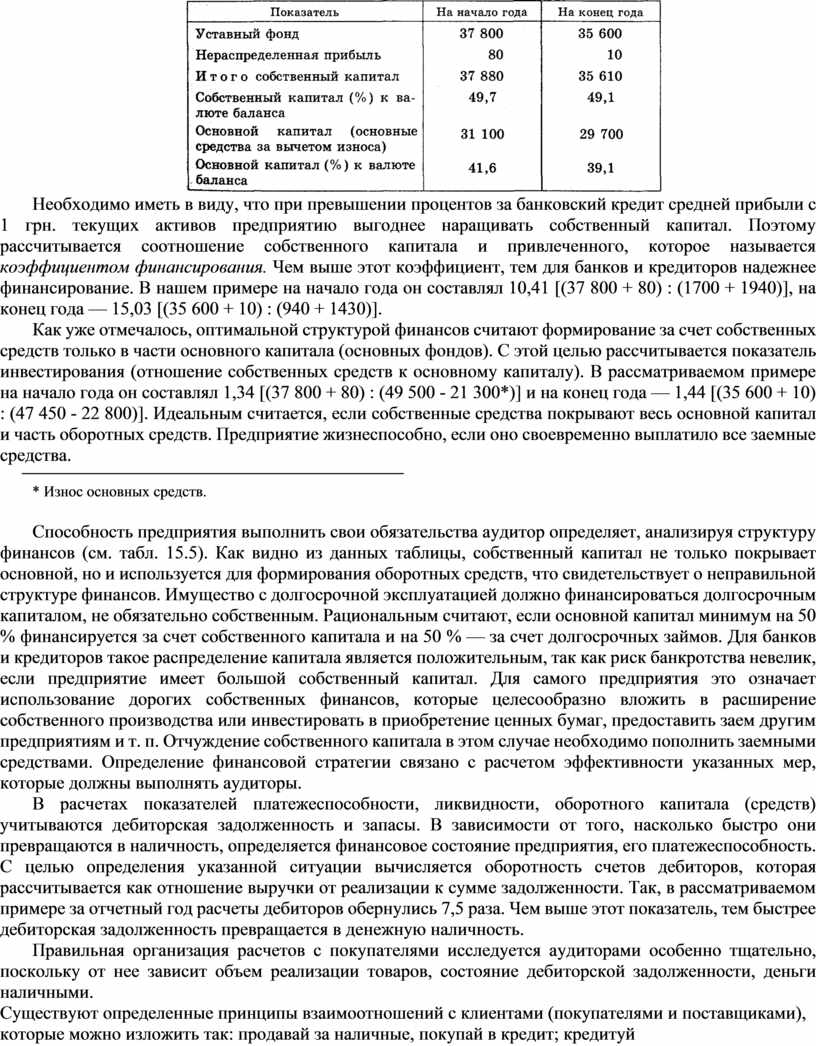 Способность предприятия выполнить свои обязательства аудитор определяет, анализируя структуру финансов (см. табл. 15.5). Как видно из данных таблицы, собственный капитал не только покрывает основной, но и используется для формирования оборотных средств, что свидетельствует о неправильной структуре финансов. Имущество с долгосрочной эксплуатацией должно финансироваться долгосрочным капиталом, не обязательно собственным. Рациональным считают, если основной капитал минимум на 50 % финансируется за счет собственного капитала и на 50 % — за счет долгосрочных займов. Для банков и кредиторов такое распределение капитала является положительным, так как риск банкротства невелик, если предприятие имеет большой собственный капитал. Для самого предприятия это означает использование дорогих собственных финансов, которые целесообразно вложить в расширение собственного производства или инвестировать в приобретение ценных бумаг, предоставить заем другим предприятиям и т. п. Отчуждение собственного капитала в этом случае необходимо пополнить заемными средствами. Определение финансовой стратегии связано с расчетом эффективности указанных мер, которые должны выполнять аудиторы.