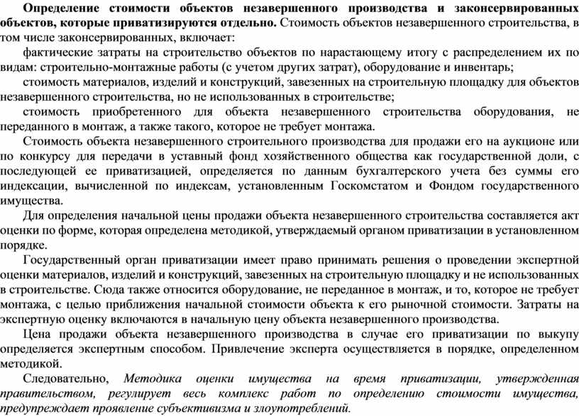Определение стоимости объектов незавершенного производства и законсервированных объектов, которые приватизируются отдельно. Стоимость объектов незавершенного строительства, в том числе законсервированных, включает: