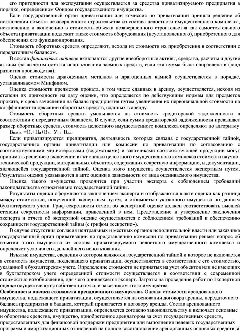 Оценка стоимости имущества, приватизируемого путем выкупа. Оценка стоимости имущества, приватизируемого путем выкупа, проводится в зависимости от состава имущества, указанного в передаточном балансе предприятия.