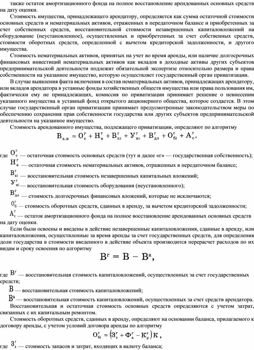 Особенности оценки стоимости арендованного имущества. Оценка стоимости арендованного имущества, подлежащего приватизации, осуществляется на основании договора аренды, передаточного баланса предприятия и баланса, который прилагается к договору аренды. Состав арендованного имущества, подлежащего приватизации, определяется согласно законодательству и включает основные и оборотные средства, имущество, приобретенное арендатором за счет государственных средств, предоставленных для финансовой поддержки предприятия или выполнения целевых государственных программ и амортизационных отчислений на полное восстановление арендованных основных средств, а также остаток амортизационного фонда на полное восстановление арендованных основных средств на дату оценки.