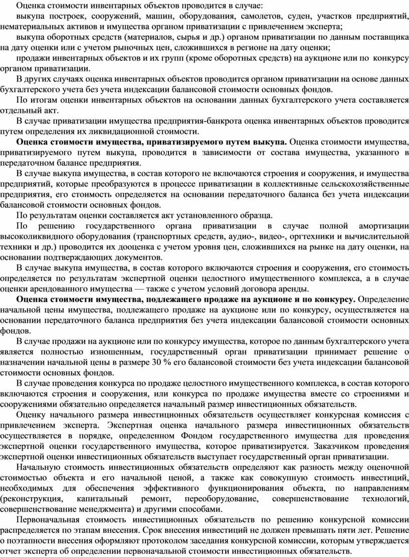 Оценка стоимости имущества, подлежащего продаже на аукционе и по конкурсу. Определение начальной цены имущества, подлежащего продаже на аукционе или по конкурсу, осуществляется на основании передаточного баланса предприятия без учета индексации балансовой стоимости основных фондов.