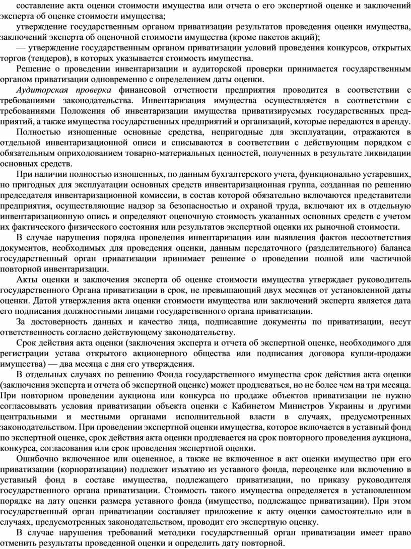 По решению органов приватизации осуществляются инвентаризация приватизируемого имущества с привлечением в случаем необходимости аудитора (аудиторской фирмы) и оценка его стоимости. Акт инвентаризации утверждается руководителем предприятия, акт оценки стоимости объекта приватизации — руководителем органа приватизации.