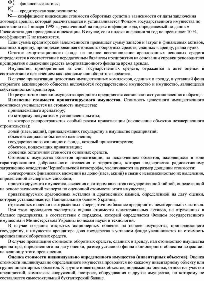 Оценку стоимости приватизируемого и сдаваемого в аренду имущества осуществляют по специальной методике, утвержденной Кабинетом Министров Украины, которая включает: