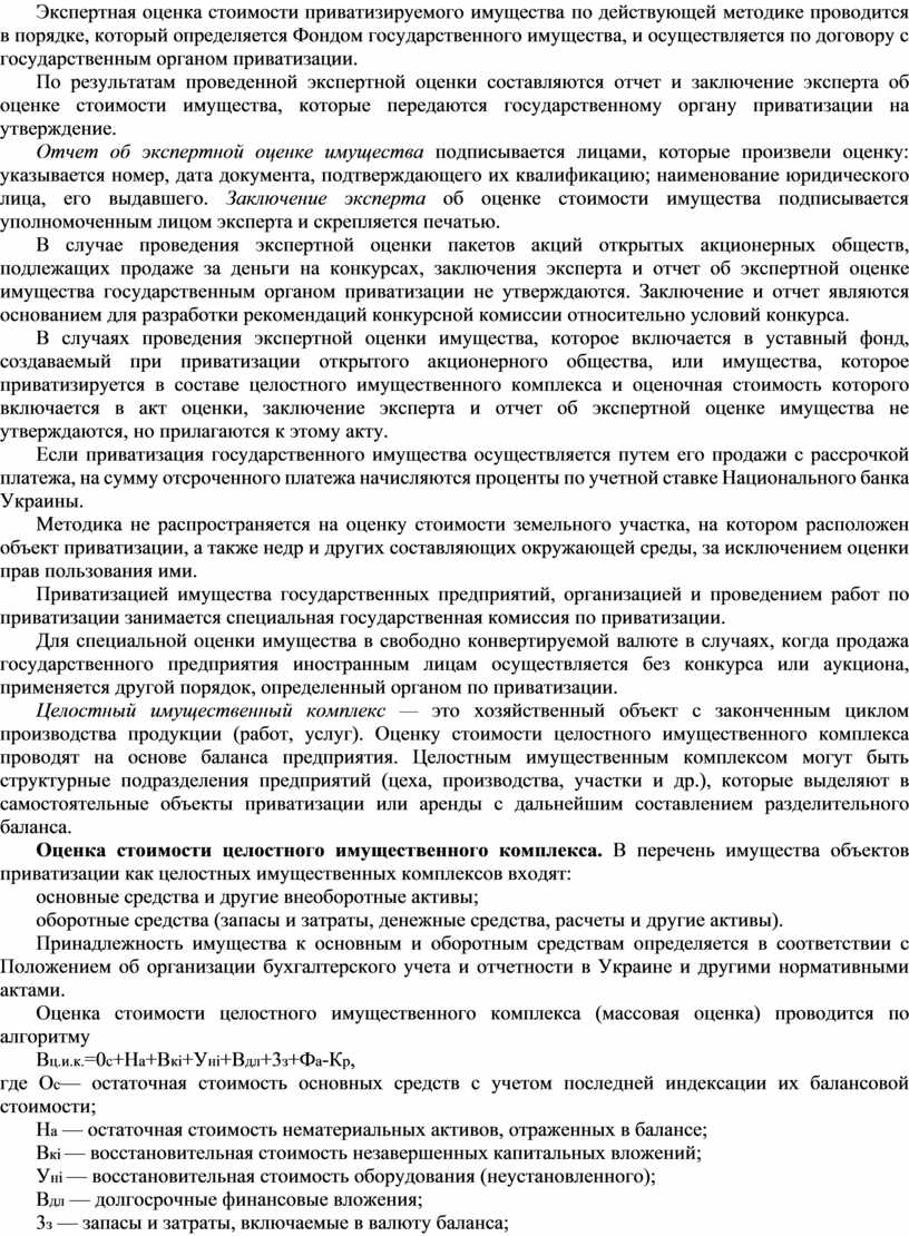 Экспертная оценка стоимости приватизируемого имущества по действующей методике проводится в порядке, который определяется Фондом государственного имущества, и осуществляется по договору с государственным органом приватизации.