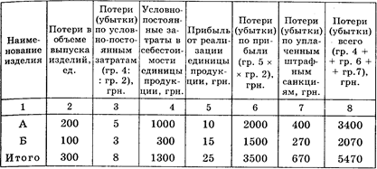 Экономические показатели единицы изделия А: цена 60 грн., полная плановая себестоимость 50 грн., условно-постоянная прибыль от реализации 10 грн. (60 - 50). За недопоставку изделия А торговому предприятию швейная фабрика заплатила штрафных санкций 400 грн.