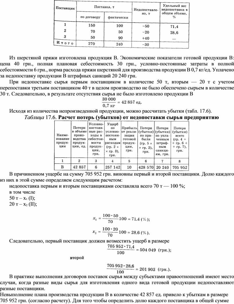 3. Ущерб, причиненный недопоставкой пряжи шерстяной тремя поставщиками, стал причиной уменьшения выпуска продукции соответствующей кондиции трикотажной фабрикой. Поставка пряжи шерстяной рассмотрена в табл. 17.5.