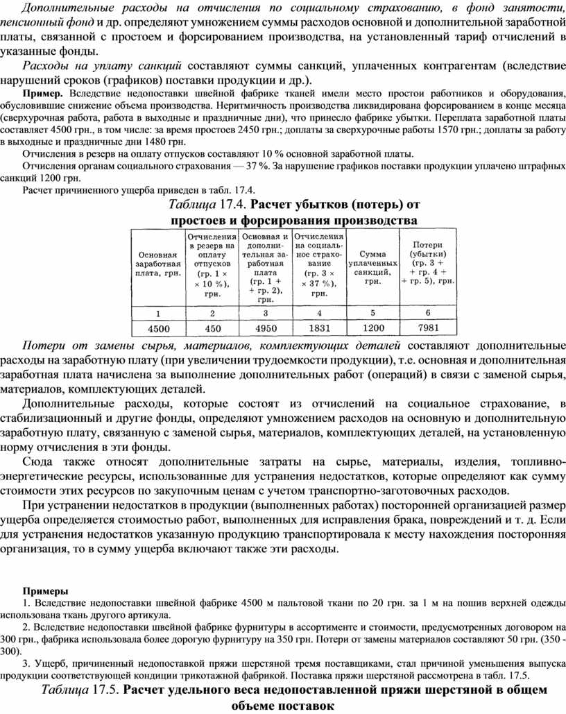 Пример. Вследствие недопоставки швейной фабрике тканей имели место простои работников и оборудования, обусловившие снижение объема производства. Неритмичность производства ликвидирована форсированием в конце месяца (сверхурочная работа, работа в выходные и праздничные дни), что принесло фабрике убытки. Переплата заработной платы составляет 4500 грн., в том числе: за время простоев 2450 грн.; доплаты за сверхурочные работы 1570 грн.; доплаты за работу в выходные и праздничные дни 1480 грн.