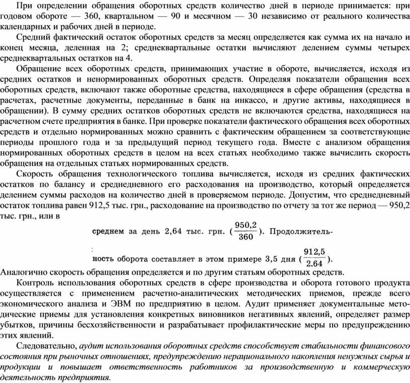 Скорость обращения технологического топлива вычисляется, исходя из средних фактических остатков по балансу и среднедневного его расходования на производство, который определяется делением суммы расходов на количество дней в проверяемом периоде. Допустим, что среднедневный остаток топлива равен 912,5 тыс. грн., расходование на производство по отчету за тот же период — 950,2 тыс. грн., или в