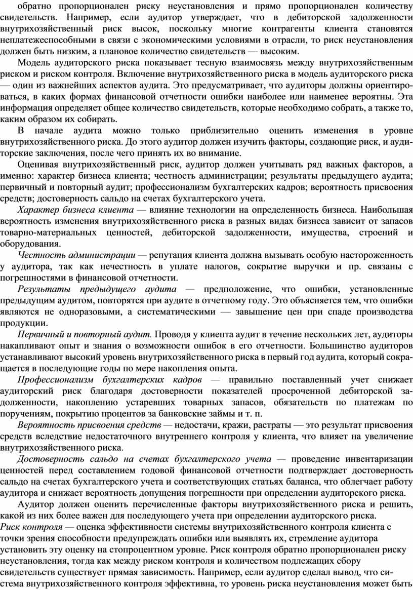 Аудитор должен оценить перечисленные факторы внутрихозяйственного риска и решить, какой из них более важен для последующего учета при определении аудиторского риска.