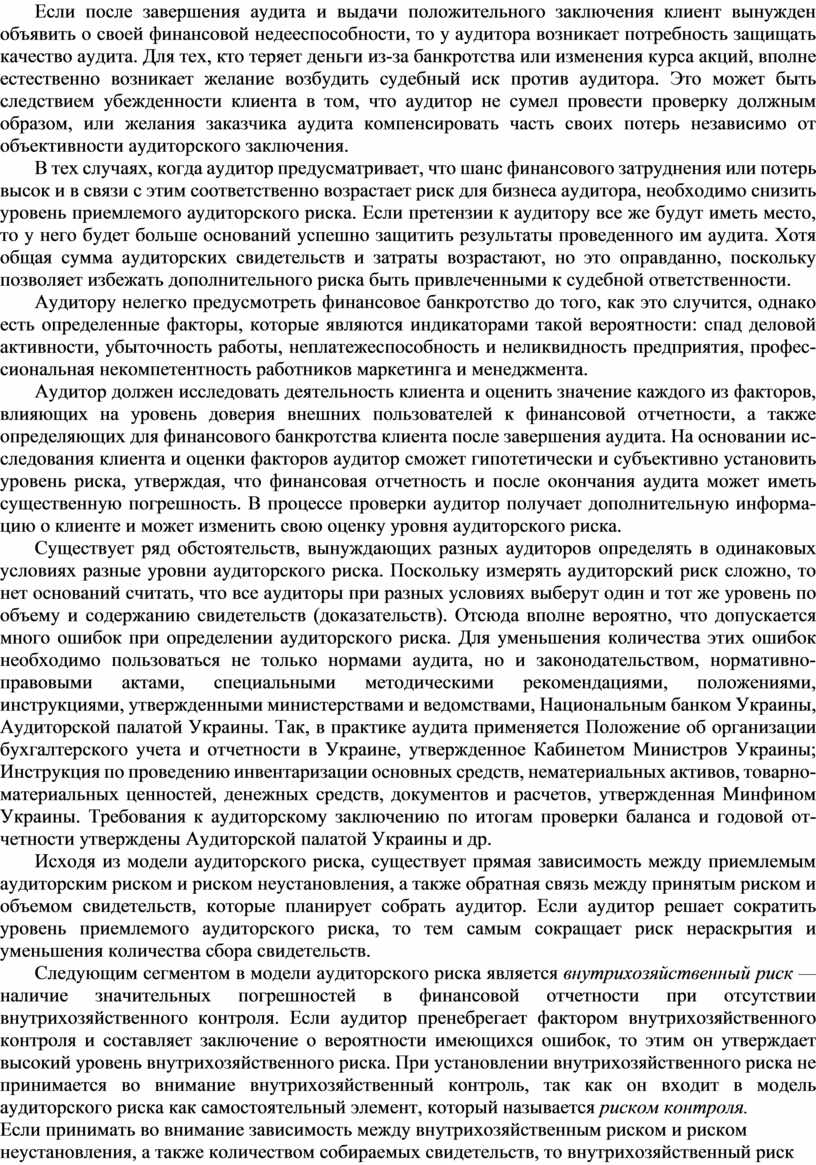 В тех случаях, когда аудитор предусматривает, что шанс финансового затруднения или потерь высок и в связи с этим соответственно возрастает риск для бизнеса аудитора, необходимо снизить уровень приемлемого аудиторского риска. Если претензии к аудитору все же будут иметь место, то у него будет больше оснований успешно защитить результаты проведенного им аудита. Хотя общая сумма аудиторских свидетельств и затраты возрастают, но это оправданно, поскольку позволяет избежать дополнительного риска быть привлеченными к судебной ответственности.