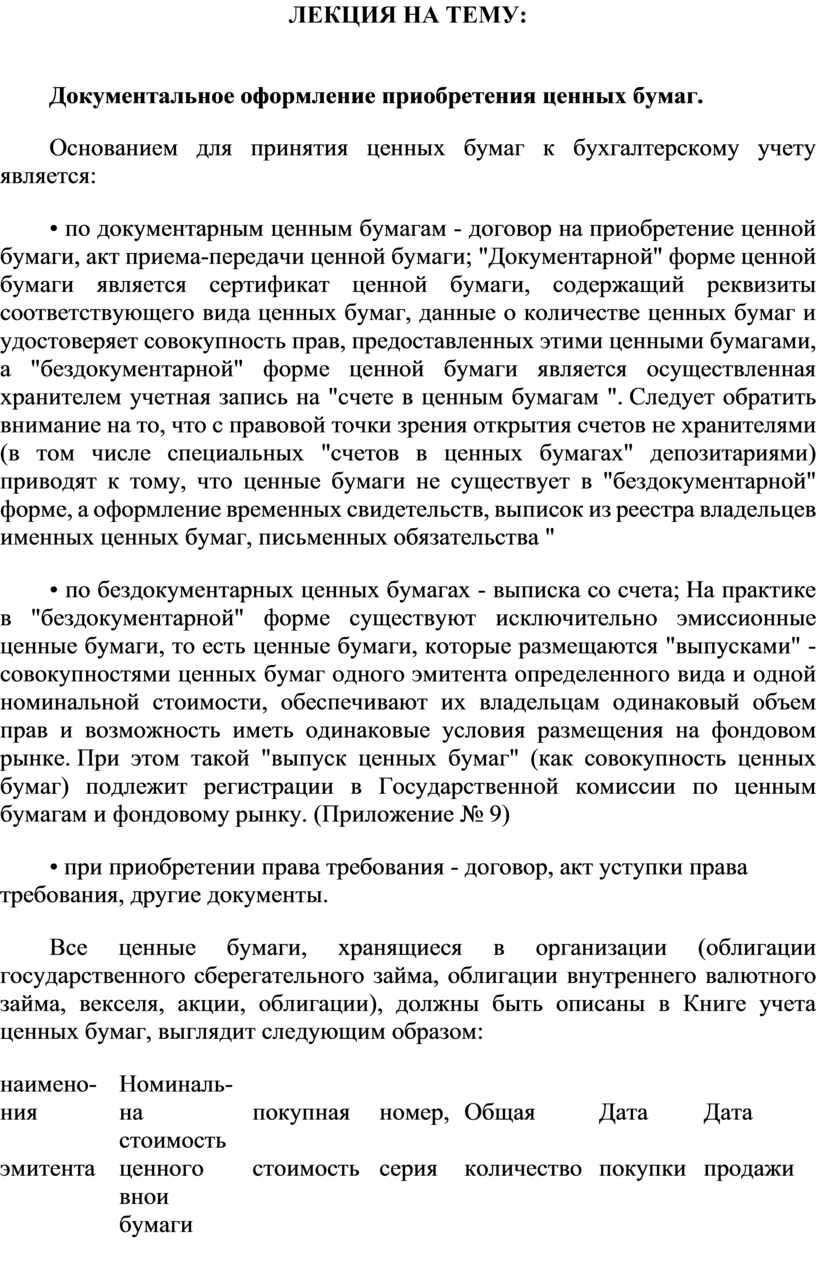 • по документарным ценным бумагам - договор на приобретение ценной бумаги, акт приема-передачи ценной бумаги; "Документарной" форме ценной бумаги является сертификат ценной бумаги, содержащий реквизиты соответствующего вида ценных бумаг, данные о количестве ценных бумаг и удостоверяет совокупность прав, предоставленных этими ценными бумагами, а "бездокументарной" форме ценной бумаги является осуществленная хранителем учетная запись на "счете в ценным бумагам ". Следует обратить внимание на то, что с правовой точки зрения открытия счетов не хранителями (в том числе специальных "счетов в ценных бумагах" депозитариями) приводят к тому, что ценные бумаги не существует в "бездокументарной" форме, а оформление временных свидетельств, выписок из реестра владельцев именных ценных бумаг, письменных обязательства "