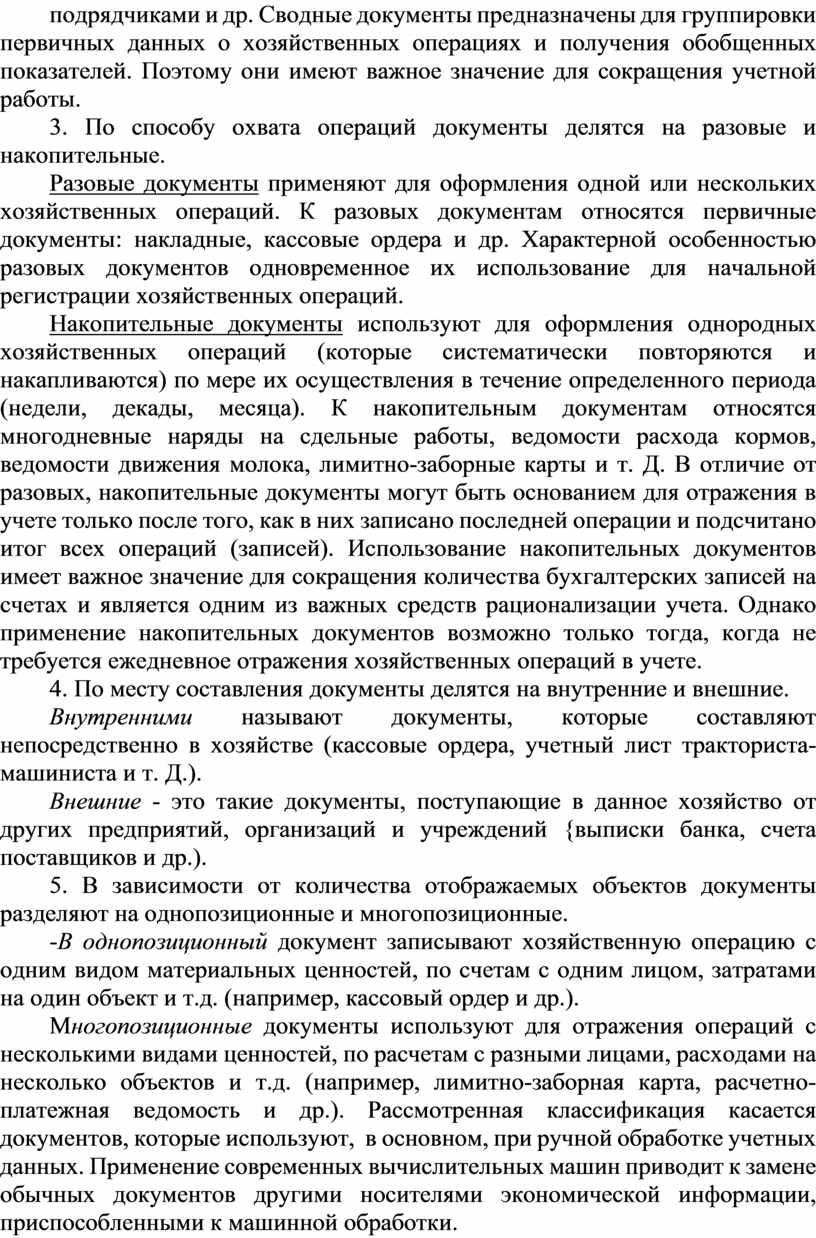 Накопительные документы используют для оформления однородных хозяйственных операций (которые систематически повторяются и накапливаются) по мере их осуществления в течение определенного периода (недели, декады, месяца). К накопительным документам относятся многодневные наряды на сдельные работы, ведомости расхода кормов, ведомости движения молока, лимитно-заборные карты и т. Д. В отличие от разовых, накопительные документы могут быть основанием для отражения в учете только после того, как в них записано последней операции и подсчитано итог всех операций (записей). Использование накопительных документов имеет важное значение для сокращения количества бухгалтерских записей на счетах и является одним из важных средств рационализации учета. Однако применение накопительных документов возможно только тогда, когда не требуется ежедневное отражения хозяйственных операций в учете.