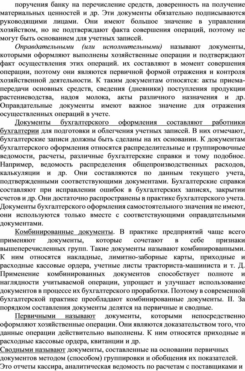 Комбинированные документы. В практике предприятий чаще всего применяют документы, которые сочетают в себе признаки вышеперечисленных групп. Такие документы называют комбинированными. К ним относятся накладные, лимитно-заборные карты, приходные и расходные кассовые ордера, учетные листы тракториста-машиниста и т. Д. Применение комбинированных документов способствует полноте и наглядности учитываемой операции, упрощает и улучшает использование документов в процессе их бухгалтерского проработки. Поэтому в современной бухгалтерской практике преобладают комбинированные документы. II. За порядком составления документы делятся на первичные и сводные.