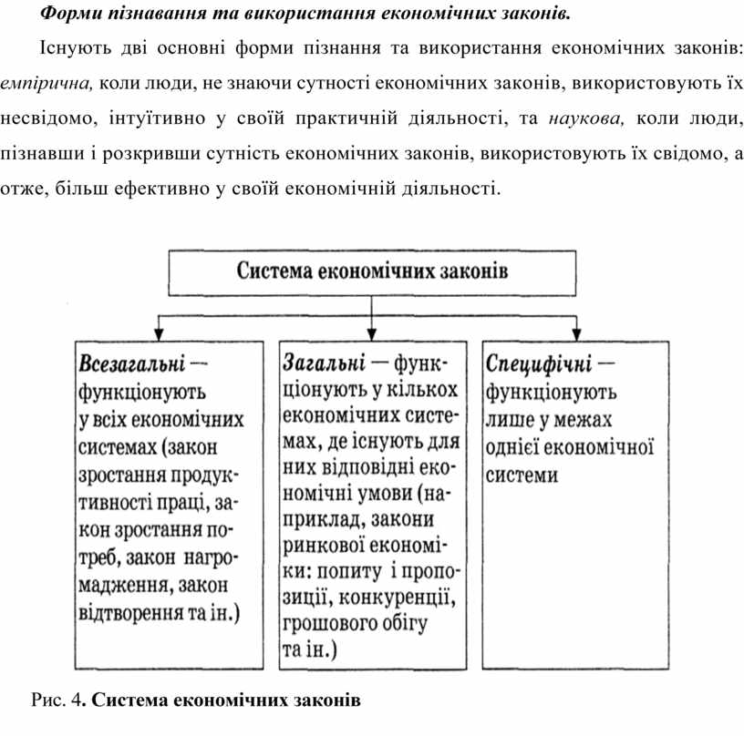Економічні закони у своїй сукупності створюють систему економічних законів (рис. 4), яка включає всезагальні, загальні і специфічні закони. Всезагальні закони вважають законами соціально-економічного прогресу, оскільки вони виражають фундаментальні основи та послідовність розвитку людського суспільства на всіх етапах.