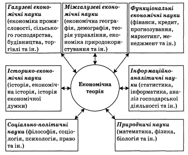 Економічна теорія є фундаментальною базою, теоретичним ядром усього комплексу економічних наук — галузевих, міжгалузевих і функціональних (рис. 10). Вона досліджує природу, глибинну суть економічних явищ і процесів, базисні соціально-економічні відносини і господарську поведінку людей у певній економічній системі. Результатом цих досліджень є розкриття економічних понять, категорій та законів, які характеризують фундаментальні основи економічного буття. Спеціальні економічні науки, спираючись на базисні положення економічної теорії, розробляють систему методів і правил практичного використання економічних категорій та законів у тій чи іншій конкретній сфері господарської діяльності. Із сукупностей економічних категорій і законів економічна теорія формує єдиний категоріально-понятійний апарат, своєрідну "економічну мову", яка інтегрує економічні науки і запобігає неоднозначному тлумаченню економічних категорій і понять у різних дисциплінах.