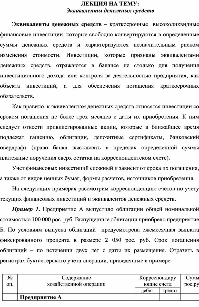 На следующих примерах рассмотрим корреспонденцию счетов по учету текущих финансовых инвестиций и эквивалентов денежных средств.