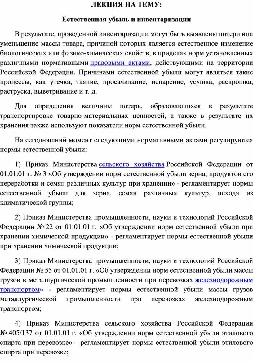 2) Приказ Министерства промышленности, науки и технологий Российской Федерации № 22 от 01.01.01 г. «Об утверждении норм естественной убыли при хранении химической продукции» - регламентирует нормы естественной убыли при хранении химической продукции;