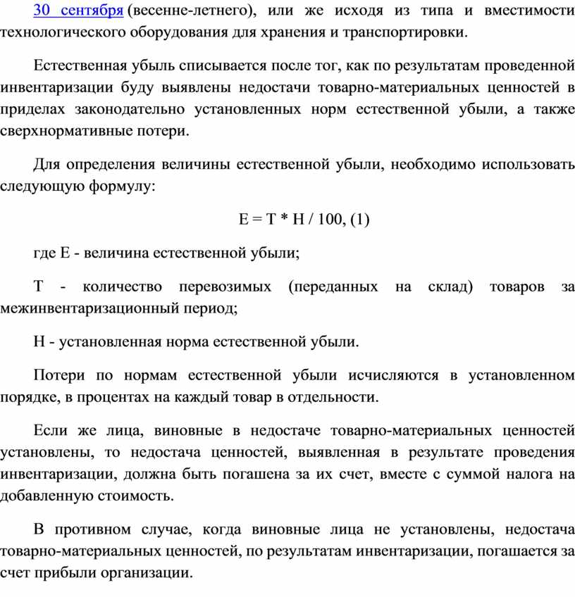 Нормы естественной убыли, применяемые при перевозке товарно-материальных ценностей всеми видами транспорта, за исключением трубопроводного, утверждаются совместно с Министерством транспорта Российской Федерации. Норма естественной убыли установленная при хранении и транспортировки товарно-материальных ценностей является допустимой величиной безвозвратных потерь (естественной убыли), которую следует определять за время хранения товара путем сопоставления его массы с массой товара, фактически принятой на хранение.