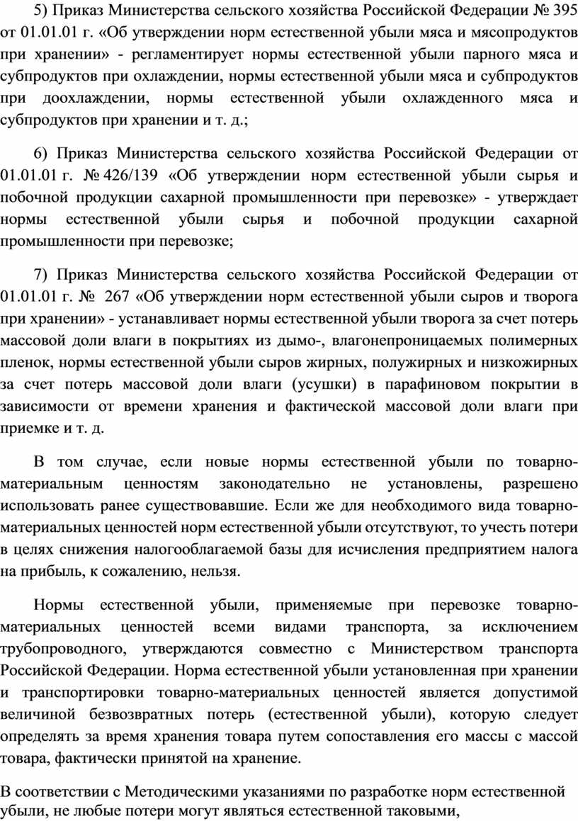 6) Приказ Министерства сельского хозяйства Российской Федерации от 01.01.01 г. № 426/139 «Об утверждении норм естественной убыли сырья и побочной продукции сахарной промышленности при перевозке» - утверждает нормы естественной убыли сырья и побочной продукции сахарной промышленности при перевозке;