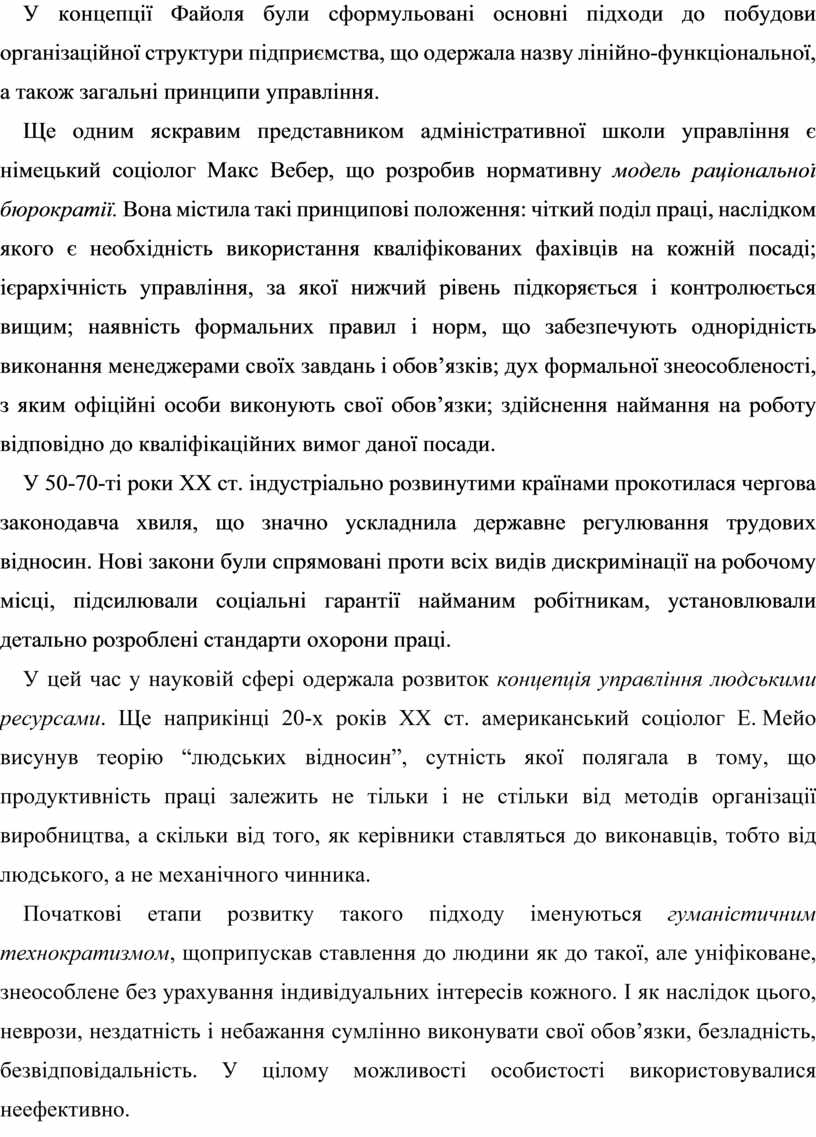 У цей час у науковій сфері одержала розвиток концепція управління людськими ресурсами. Ще наприкінці 20-х років XX ст. американський соціолог Е. Мейо висунув теорію “людських відносин”, сутність якої полягала в тому, що продуктивність праці залежить не тільки і не стільки від методів організації виробництва, а скільки від того, як керівники ставляться до виконавців, тобто від людського, а не механічного чинника.