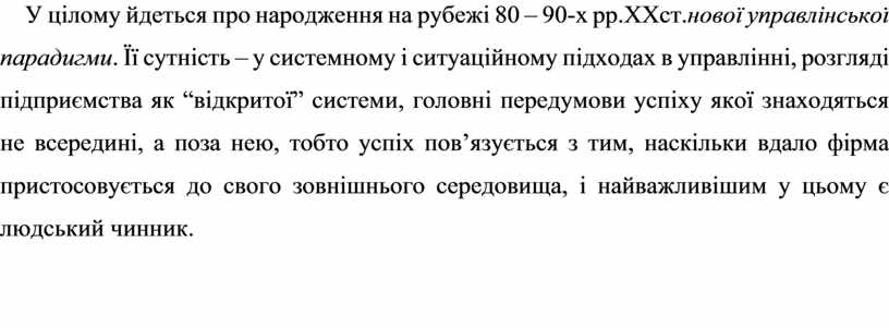 У цілому йдеться про народження на рубежі 80 – 90-х рр.XXст.нової управлінської парадигми. Її сутність – у системному і ситуаційному підходах в управлінні, розгляді підприємства як “відкритої” системи, головні передумови успіху якої знаходяться не всередині, а поза нею, тобто успіх пов’язується з тим, наскільки вдало фірма пристосовується до свого зовнішнього середовища, і найважливішим у цьому є людський чинник.