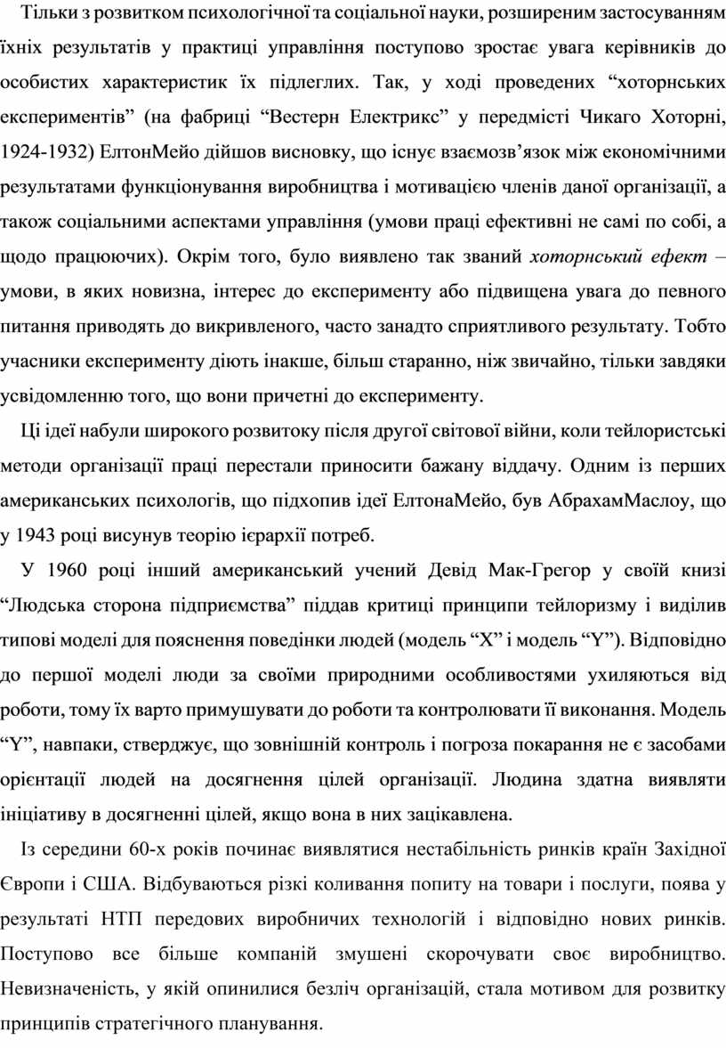 Тільки з розвитком психологічної та соціальної науки, розширеним застосуванням їхніх результатів у практиці управління поступово зростає увага керівників до особистих характеристик їх підлеглих. Так, у ході проведених “хоторнських експериментів” (на фабриці “Вестерн Електрикс” у передмісті Чикаго Хоторні, 1924-1932) ЕлтонМейо дійшов висновку, що існує взаємозв’язок між економічними результатами функціонування виробництва і мотивацією членів даної організації, а також соціальними аспектами управління (умови праці ефективні не самі по собі, а щодо працюючих). Окрім того, було виявлено так званий хоторнський ефект – умови, в яких новизна, інтерес до експерименту або підвищена увага до певного питання приводять до викривленого, часто занадто сприятливого результату. Тобто учасники експерименту діють інакше, більш старанно, ніж звичайно, тільки завдяки усвідомленню того, що вони причетні до експерименту.