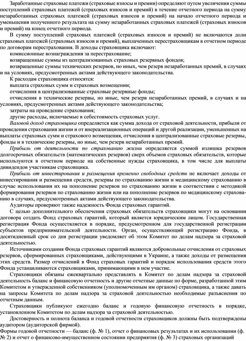 Изучение аудитором специализированной годовой формы № 4 страховой организации, типовых форм бухгалтерской отчетности позволяет сделать обоснованное заключение о финансовом состоянии страховщика не только относительно платежеспособности, но и достаточности резервных фондов и их использования, ликвидности резервных фондов и их использования, ликвидности и обеспечения страхователей гарантией на соблюдение страховщиком договорных условий по срокам и объему выплаты причитающихся им средств, предупреждения банкротства.