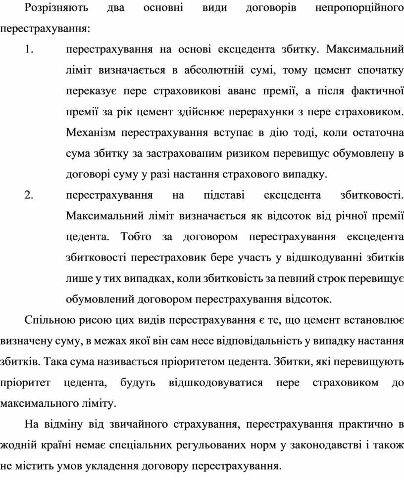 На відміну від пропорційного перестрахування, де компенсування збитків або шкоди розподіляються між цементом і пере страховиком у пропорції, що відповідає розподілу страхових сум і премій, у непропорційному перестрахуванні виплати перестраховика визначаються виключно величиною збитків. Призначення непропорційного перестрахування - гарантувати відповідальність страховика за прийнятими ризиками щодо великого сукупного збтку за визначений період. Отже, у непропорційному перестрахуванні цемент сам сплачує збитки до певного розміру, а перевищення цього розміру оплачує перестраховик у межах ліміту відповідальності за договором.