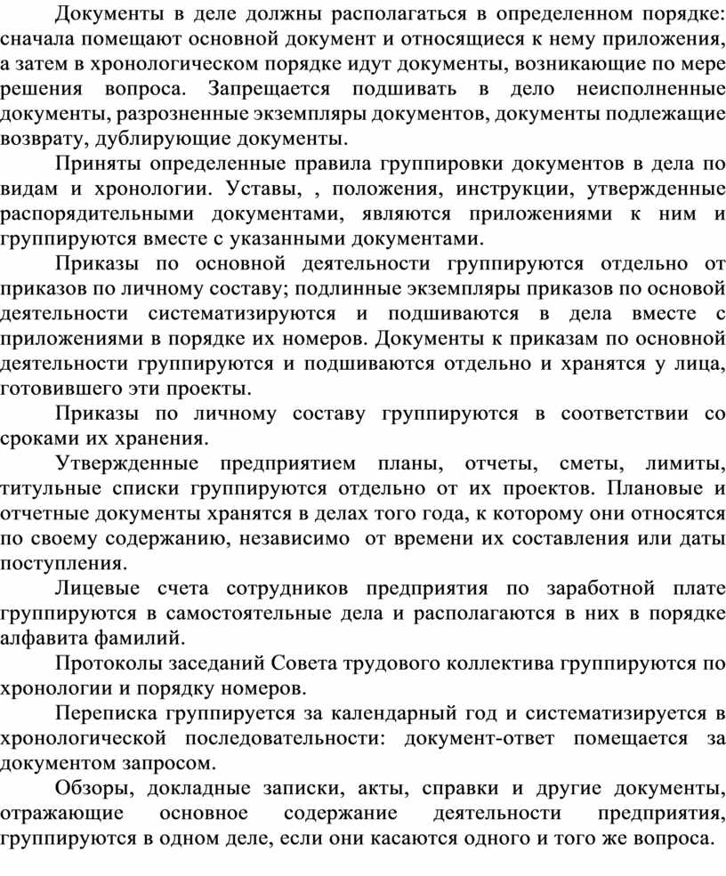 Документы в деле должны располагаться в определенном порядке: сначала помещают основной документ и относящиеся к нему приложения, а затем в хронологическом порядке идут документы, возникающие по мере решения вопроса. Запрещается подшивать в дело неисполненные документы, разрозненные экземпляры документов, документы подлежащие возврату, дублирующие документы.