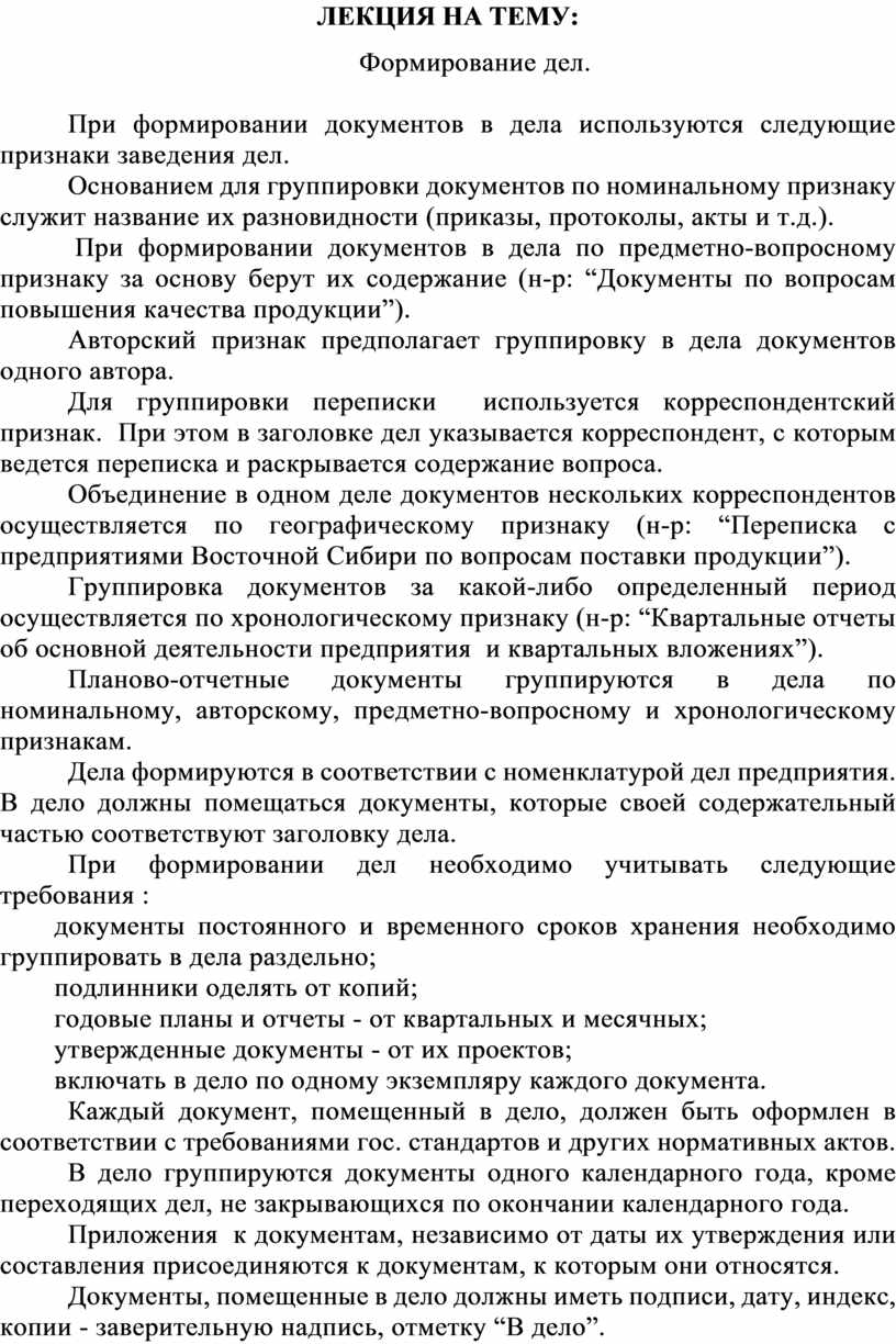 Дела формируются в соответствии с номенклатурой дел предприятия. В дело должны помещаться документы, которые своей содержательный частью соответствуют заголовку дела.