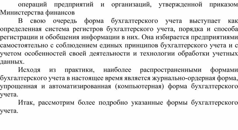 Исходя из практики, наиболее распространенными формами бухгалтерского учета в настоящее время является журнально-ордерная форма, упрощенная и автоматизированная (компьютерная) форма бухгалтерского учета.