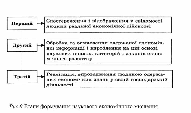 Наукове мислення — всебічне і глибоке пізнання людиною економічної дійсності на основі використання наукових методів дослідження, що дозволяє розкрити сутність економічних процесів, об'єктивно оцінити їхню суспільну значущість і прогнозувати тенденції розвитку в майбутньому (рис. 9).