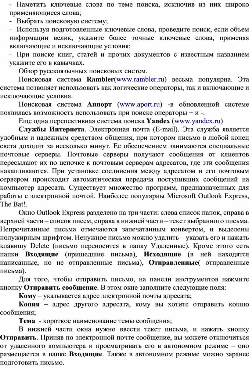 Поисковая система Rambler(www.rambler.ru) весьма популярна. Эта система позволяет использовать как логические операторы, так и включающие и исключающие условия.
