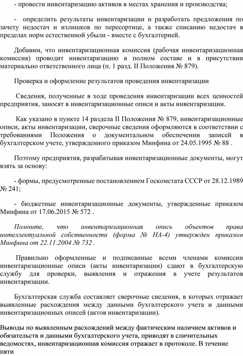 Определены руководителем сроки проведения инвентаризации не могут превышать сроков, установленных пунктом 10 раздела I Положения № 879.
