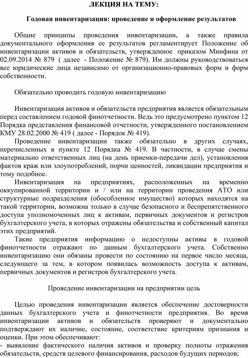 Общие принципы проведения инвентаризации, а также правила документального оформления ее результатов регламентирует Положение об инвентаризации активов и обязательств, утвержденное приказом Минфина от 02.09.2014 № 879 ( далее - Положение № 879). Им должны руководствоваться все юридические лица независимо от организационно-правовых форм и форм собственности.