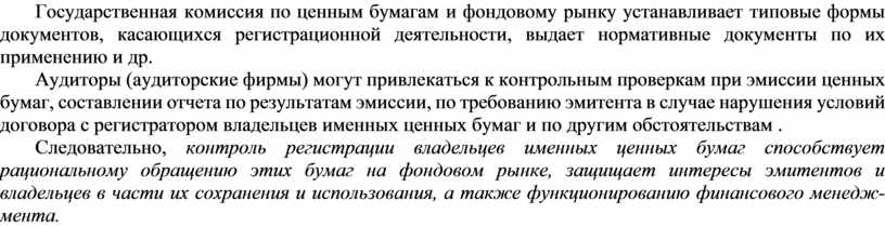 Следовательно, контроль регистрации владельцев именных ценных бумаг способствует рациональному обращению этих бумаг на фондовом рынке, защищает интересы эмитентов и владельцев в части их сохранения и использования, а также функционированию финансового менеджмента.