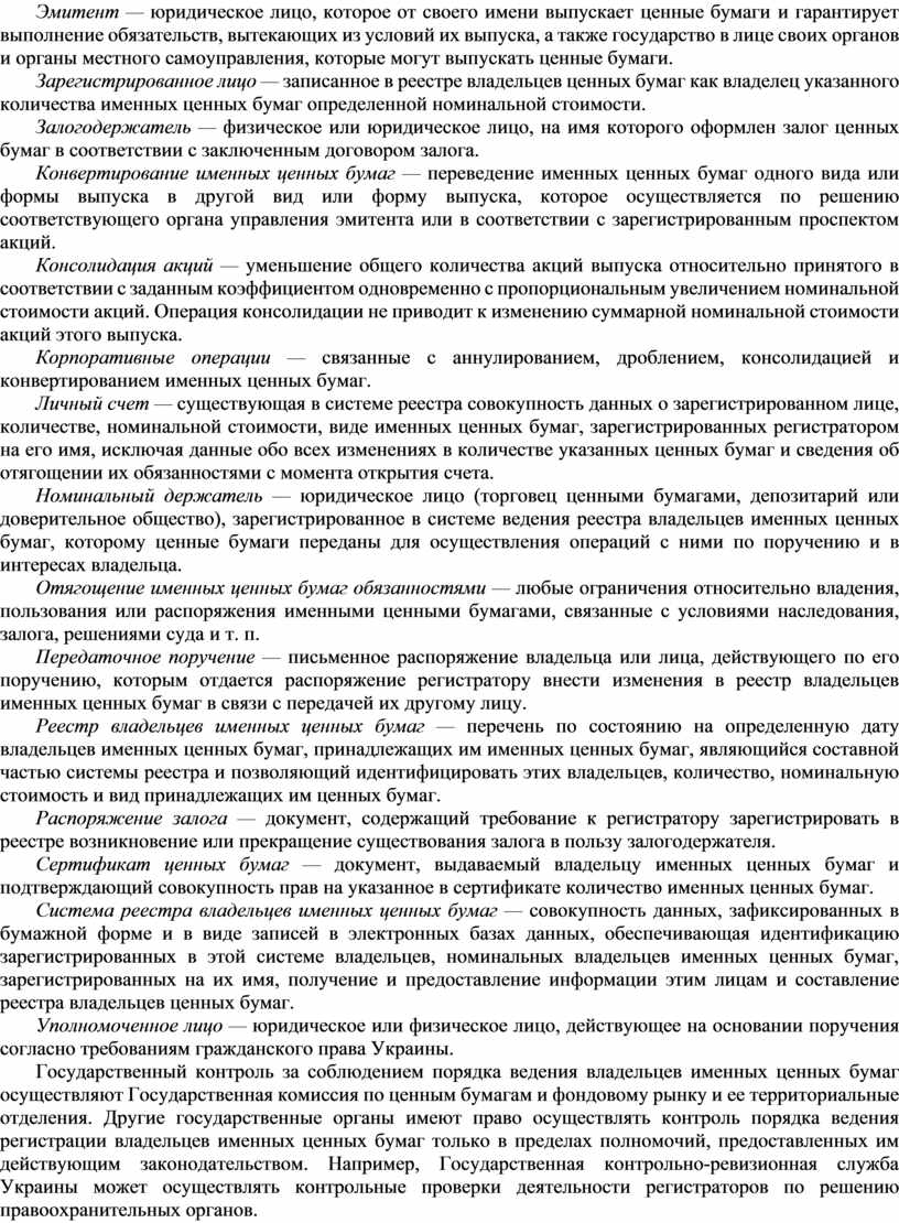 Контроль за обращением ценных бумаг в Украине осуществляется Государственной комиссией по ценным бумагам и фондовому рынку. В частности, ей утверждено Положение о порядке ведения реестров владельцев именных ценных бумаг, которым предусмотрен порядок ведения реестров владельцами. Если количество именных ценных бумаг эмитента превышает 500, то эмитент обязан поручить ведение реестра регистратору, заключая с ним соответствующий договор. Регистратор должен быть юридическим лицом, со штатом не менее трех работников (эмитенты, ведущие собственный реестр самостоятельно, — одного), которые непосредственно занимаются регистрационной деятельностью. Для этого необходимо, чтобы работники были аттестованы и получили квалификационные сертификаты от Государственной комиссии по ценным бумагам и фондовому рынку или ее территориальных отделений. Регистратор использует в своей деятельности также Положение о деятельности по учету прав собственности на именные ценные бумаги и депозитную деятельность и другие нормативно-правовые акты.
