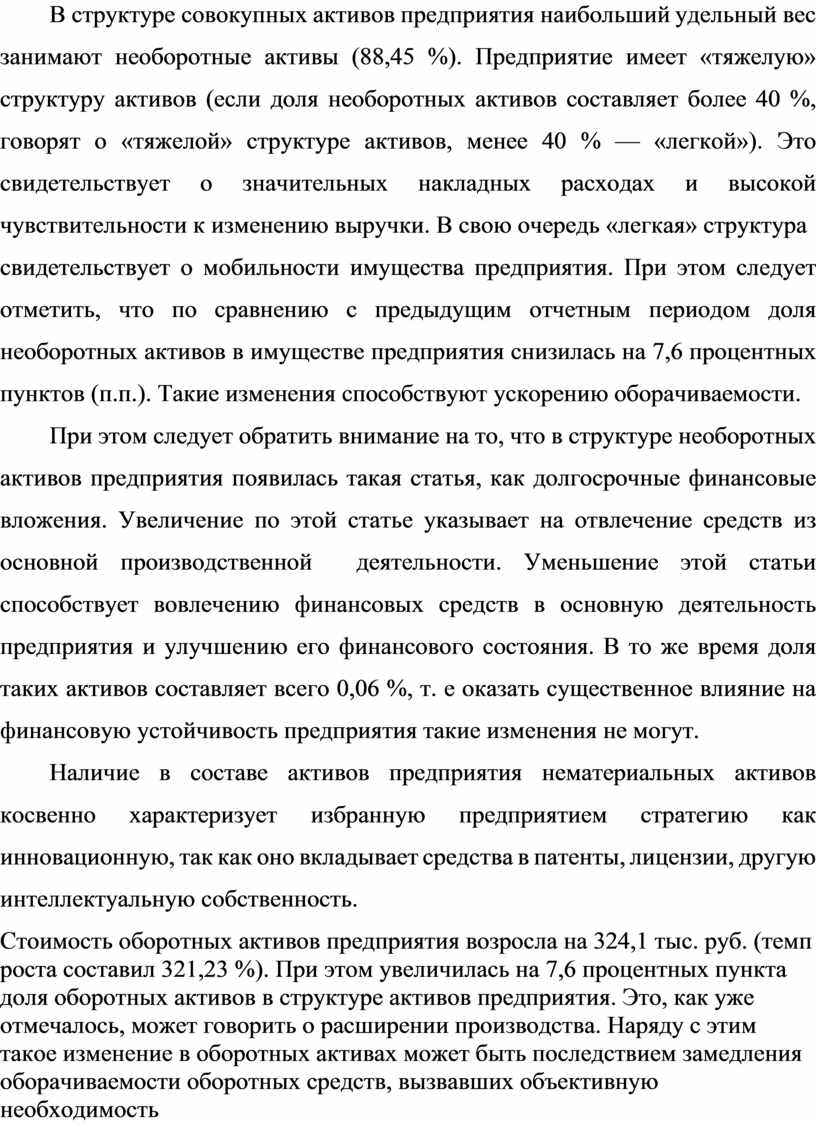 В структуре совокупных активов предприятия наибольший удельный вес занимают необоротные активы (88,45 %). Предприятие имеет «тяжелую» структуру активов (если доля необоротных активов составляет более 40 %, говорят о «тяжелой» структуре активов, менее 40 % — «легкой»). Это свидетельствует о значительных накладных расходах и высокой чувствительности к изменению выручки. В свою очередь «легкая» структура