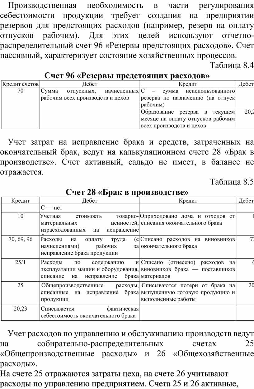 Производственная необходимость в части регулирования себестоимости продукции требует создания на предприятии резервов для предстоящих расходов (например, резерв на оплату отпусков рабочим). Для этих целей используют отчетно-распределительный счет 96 «Резервы предстоящих расходов». Счет пассивный, характеризует состояние хозяйственных процессов.