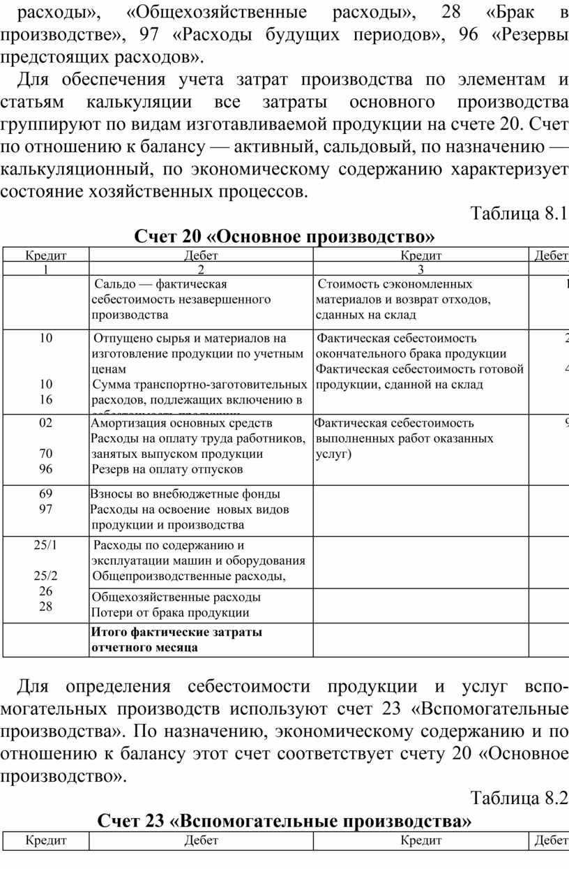 Для обеспечения учета затрат производства по элементам и статьям калькуляции все затраты основного производства группируют по видам изготавливаемой продукции на счете 20. Счет по отношению к балансу — активный, сальдовый, по назначению — калькуляционный, по экономическому содержанию характеризует состояние хозяйственных процессов.