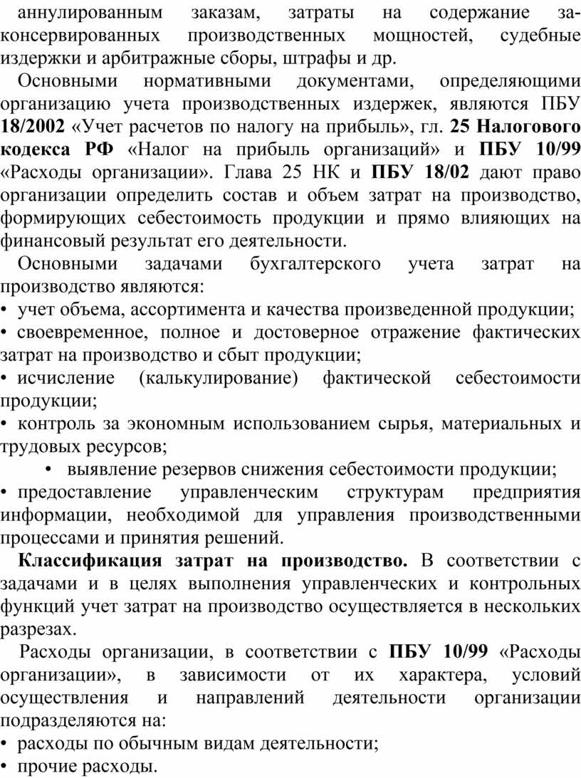 Основными нормативными документами, определяющими организацию учета производственных издержек, являются ПБУ 18/2002 «Учет расчетов по налогу на прибыль», гл. 25 Налогового кодекса РФ «Налог на прибыль организаций» и ПБУ 10/99 «Расходы организации». Глава 25 НК и ПБУ 18/02 дают право организации определить состав и объем затрат на производство, формирующих себестоимость продукции и прямо влияющих на финансовый результат его деятельности.