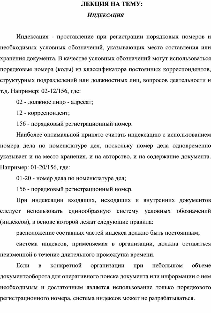Индексация - проставление при регистрации порядковых номеров и необходимых условных обозначений, указывающих место составления или хранения документа. В качестве условных обозначений могут использоваться порядковые номера (коды) из классификатора постоянных корреспондентов, структурных подразделений или должностных лиц, вопросов деятельности и т.д. Например: 02-12/156, где: