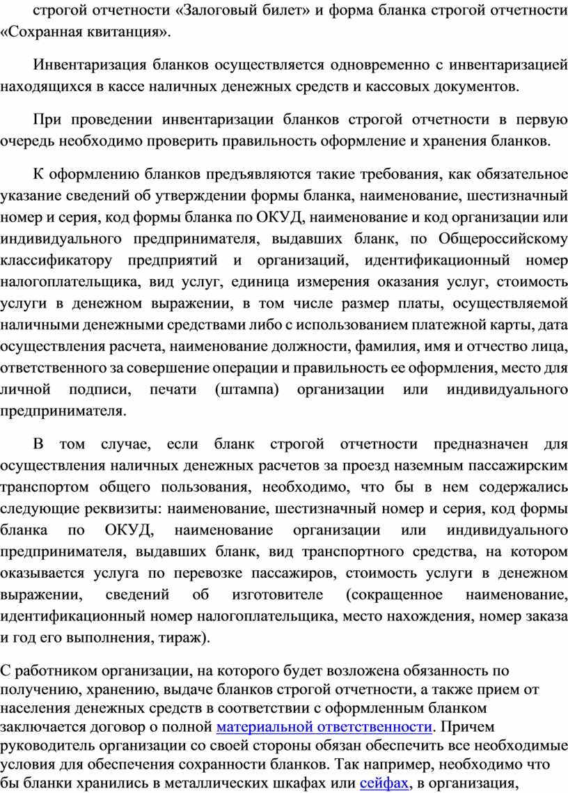 С работником организации, на которого будет возложена обязанность по получению, хранению, выдаче бланков строгой отчетности, а также прием от населения денежных средств в соответствии с оформленным бланком заключается договор о полной материальной ответственности. Причем руководитель организации со своей стороны обязан обеспечить все необходимые условия для обеспечения сохранности бланков. Так например, необходимо что бы бланки хранились в металлических шкафах или сейфах, в организация, получающих такие бланки в большом количестве (например вокзальные кассы) необходимо оборудование специальных помещений, причем по окончании рабочего дня места хранения бланков опечатываются или опломбируются.