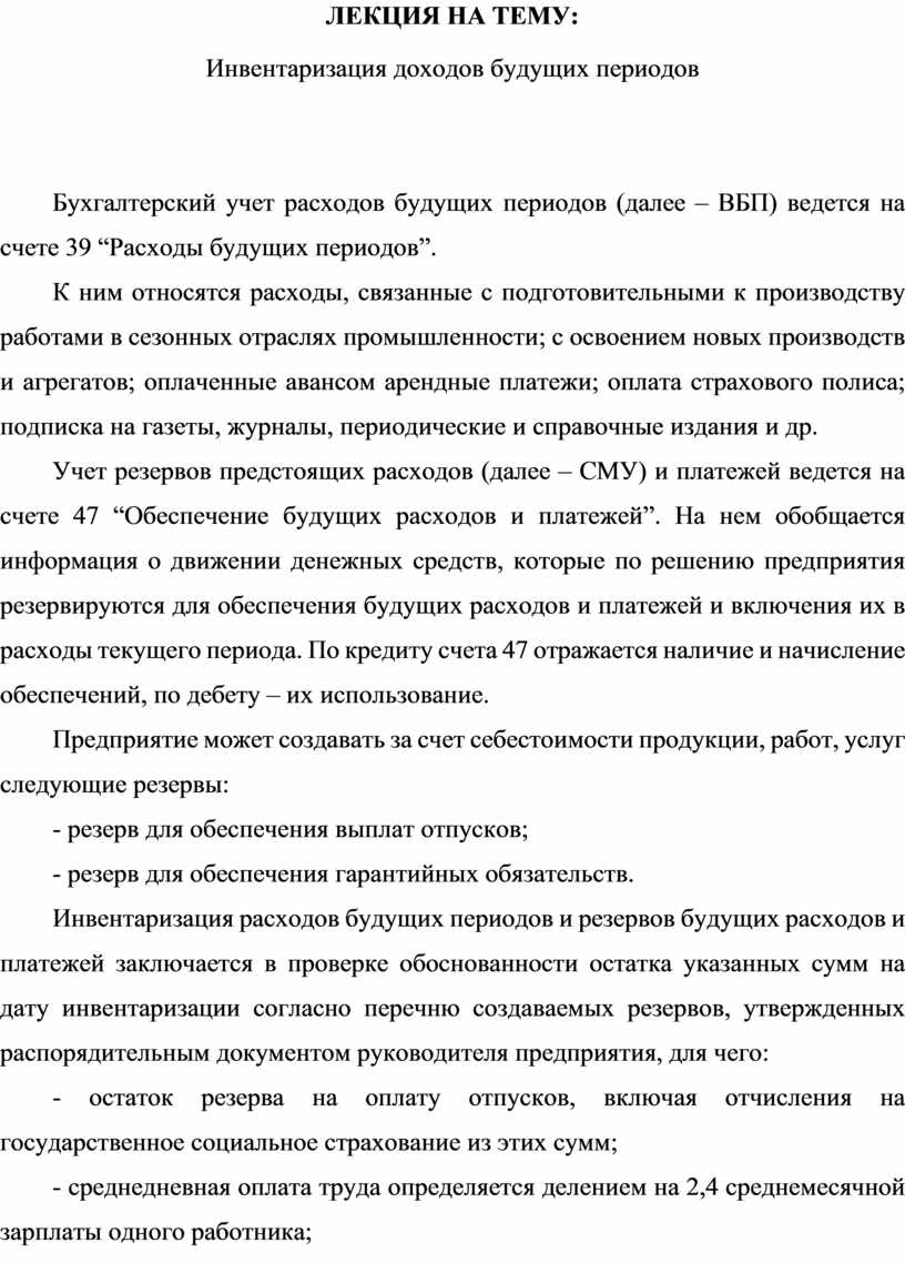Инвентаризация расходов будущих периодов и резервов будущих расходов и платежей заключается в проверке обоснованности остатка указанных сумм на дату инвентаризации согласно перечню создаваемых резервов, утвержденных распорядительным документом руководителя предприятия, для чего: