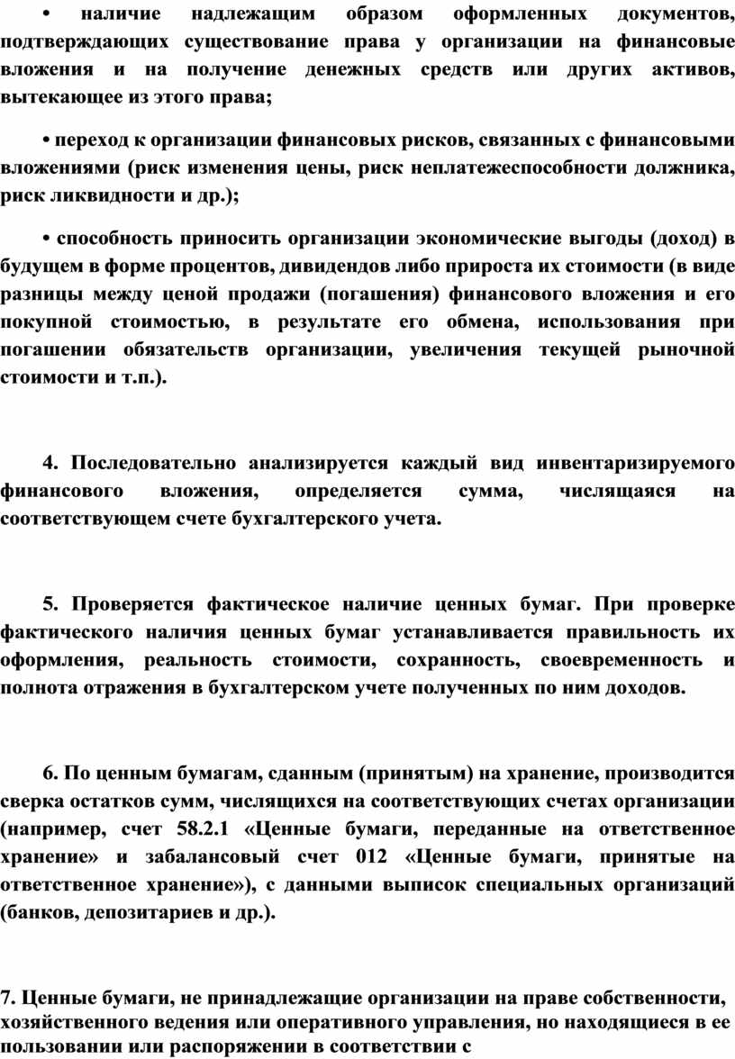 5. Проверяется фактическое наличие ценных бумаг. При проверке фактического наличия ценных бумаг устанавливается правильность их оформления, реальность стоимости, сохранность, своевременность и полнота отражения в бухгалтерском учете полученных по ним доходов.