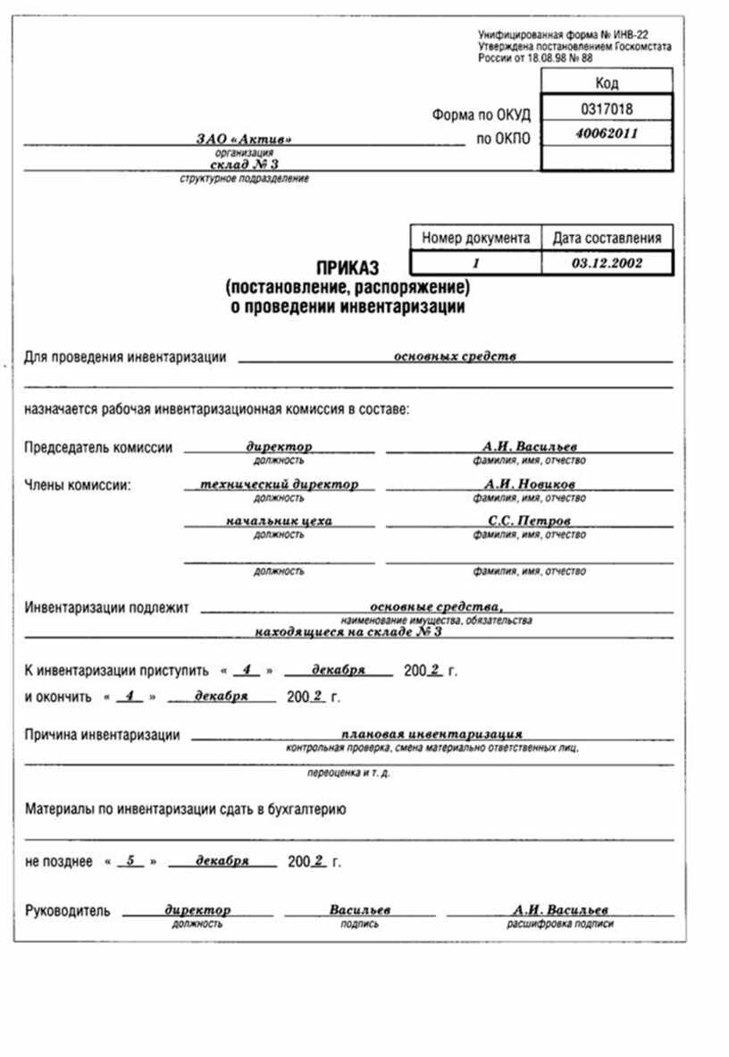 Пример заполнения приказа о проведении инвентаризации форма ИНВ-22