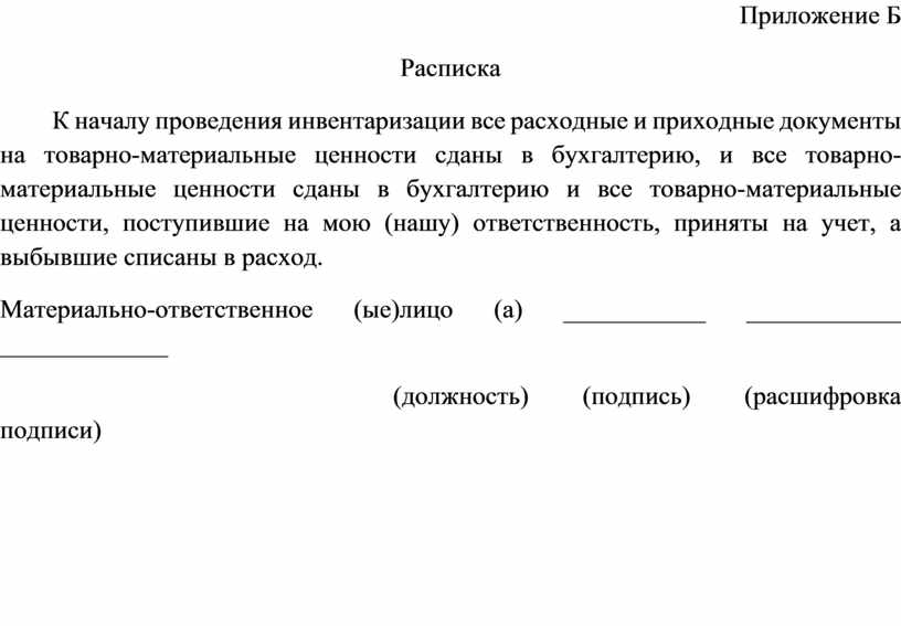 К началу проведения инвентаризации все расходные и приходные документы на товарно-материальные ценности сданы в бухгалтерию, и все товарно-материальные ценности сданы в бухгалтерию и все товарно-материальные ценности, поступившие на мою (нашу) ответственность, приняты на учет, а выбывшие списаны в расход.