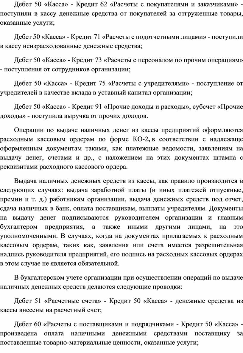 Дебет 50 «Касса» - Кредит 62 «Расчеты с покупателями и заказчиками» - поступили в кассу денежные средства от покупателей за отгруженные товары, оказанные услуги;