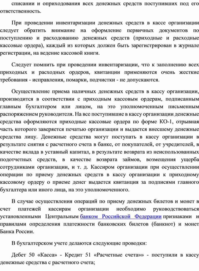 Осуществление приема наличных денежных средств в кассу организации, производится в соответствии с приходным кассовым ордерам, подписанным главным бухгалтером или лицом, на это уполномоченным письменным распоряжением руководителя. На все поступившие в кассу организации денежные средства оформляются приходные кассовые ордера по форме КО-1, отрывная часть которого заверяется печатью организации и выдается внесшему денежные средства лицу. Денежные средства могут поступать в кассу организации в результате снятия с расчетного счета в банке, от покупателей, от учредителей, в качестве вклада в уставный капитал, в результате возврата из неиспользованных подотчетных средств, в качестве возврата займов, возмещения ущерба сотрудниками организации, и т. д. Кассиром организации при осуществлении операции по приему денежных средств в кассу организации к приходному кассовому ордеру о приеме денег выдается квитанция за подписями главного бухгалтера или иного лица, на это уполномоченного.